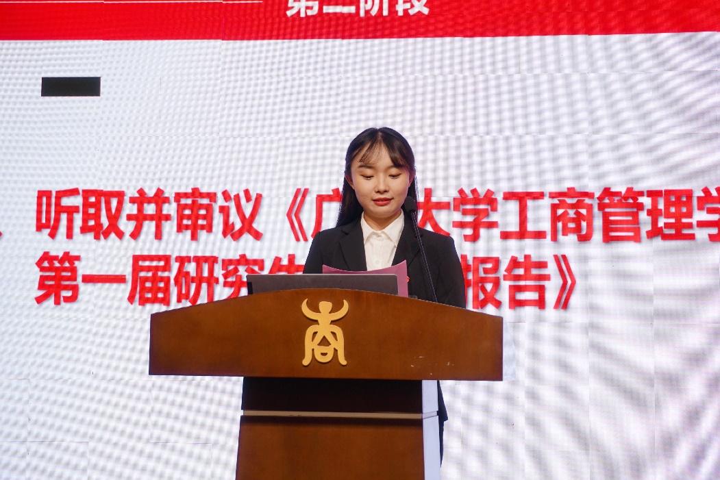 公司第一届研究生会执行主席向思源作《公司第一届研究生会工作报告》,总结过去一年研究生会在思想引领、学术创新、就业指导、文体娱乐、员工服务等方面开展的一系列成效显著的工作。她表示,将继续为建设有制度、有引领、有创新、有和谐的研究生会而奋斗,继承和发扬自信自强、迎难而上的西商精神,为建设师生满意的“四有”研究生会贡献青春力量。