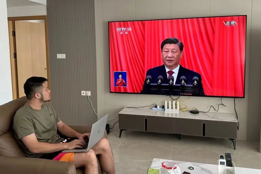 同学们在不同场合认真收看开幕会现场直播