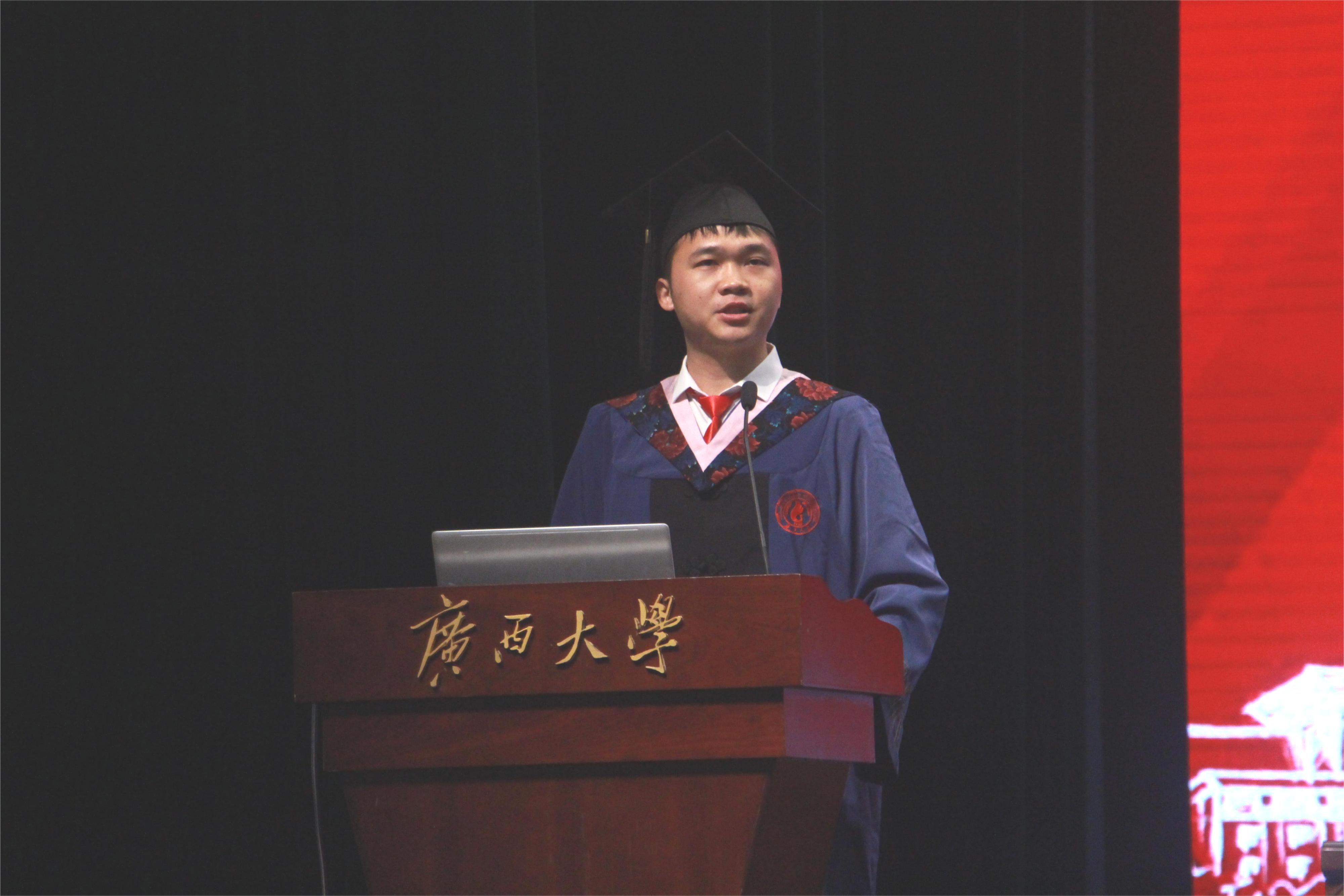 本科毕业生代表王璐与大家一同回忆大学四年的青葱岁月,对身边的同学、老师表达了感谢,自己取得的成绩及获得的荣誉离不开公司与公司给予的机会,离不开老师和同学们的帮助。她表示,大学四年的结束并不意味着学习生涯的结束,毕业生们应牢记勤恳朴诚、厚学致新的校训,厚德博学、创新卓越的院训,用青春书写无愧时代,无愧历史的篇章。