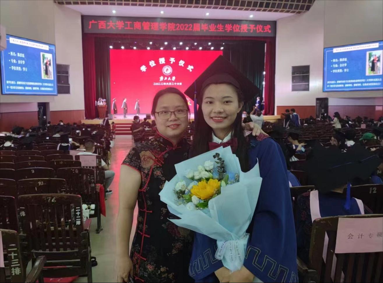 朱帮助经理为毕业生发放学位证书并合影留恋