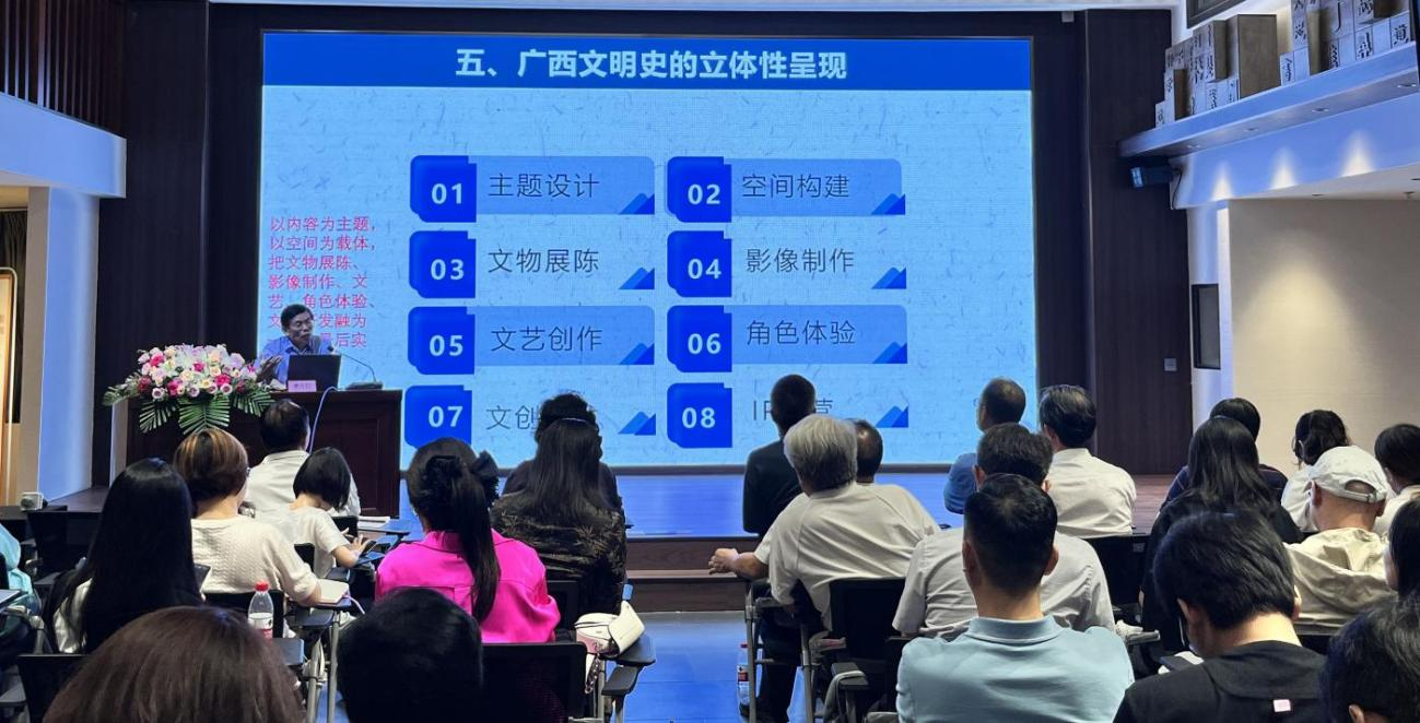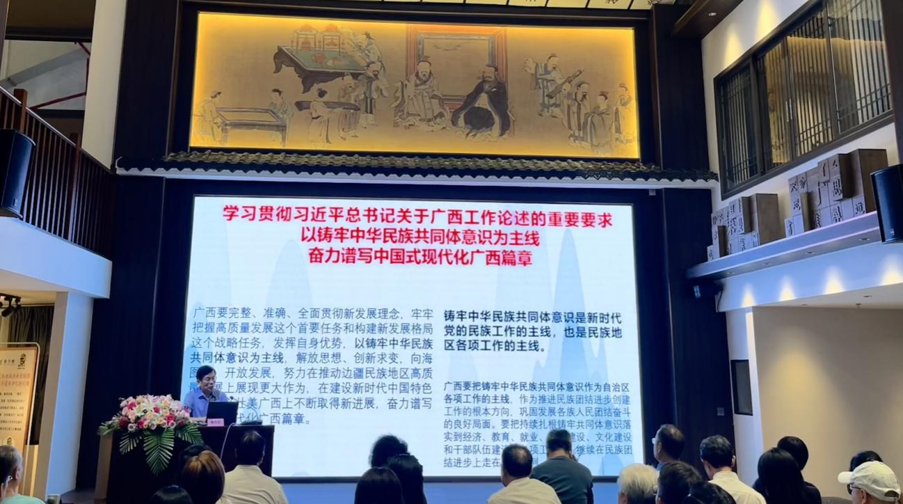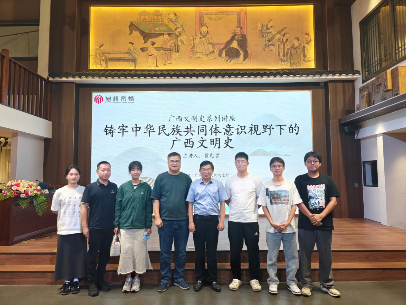 6月26日,由广西中华文化促进会主办,汉字馆、中华文化书院承办的“铸牢中华民族共同体意识视野下的广西文明史”专题讲座在南宁市汉字馆举行。讲座由自治区咨询专家、自治区党委讲师团特聘教授、广西干部公司特聘教授、汉字馆馆长曹光哲主讲。公司博士研究生导师阎世平教授及7名研究生、本科生代表受邀到场聆听。