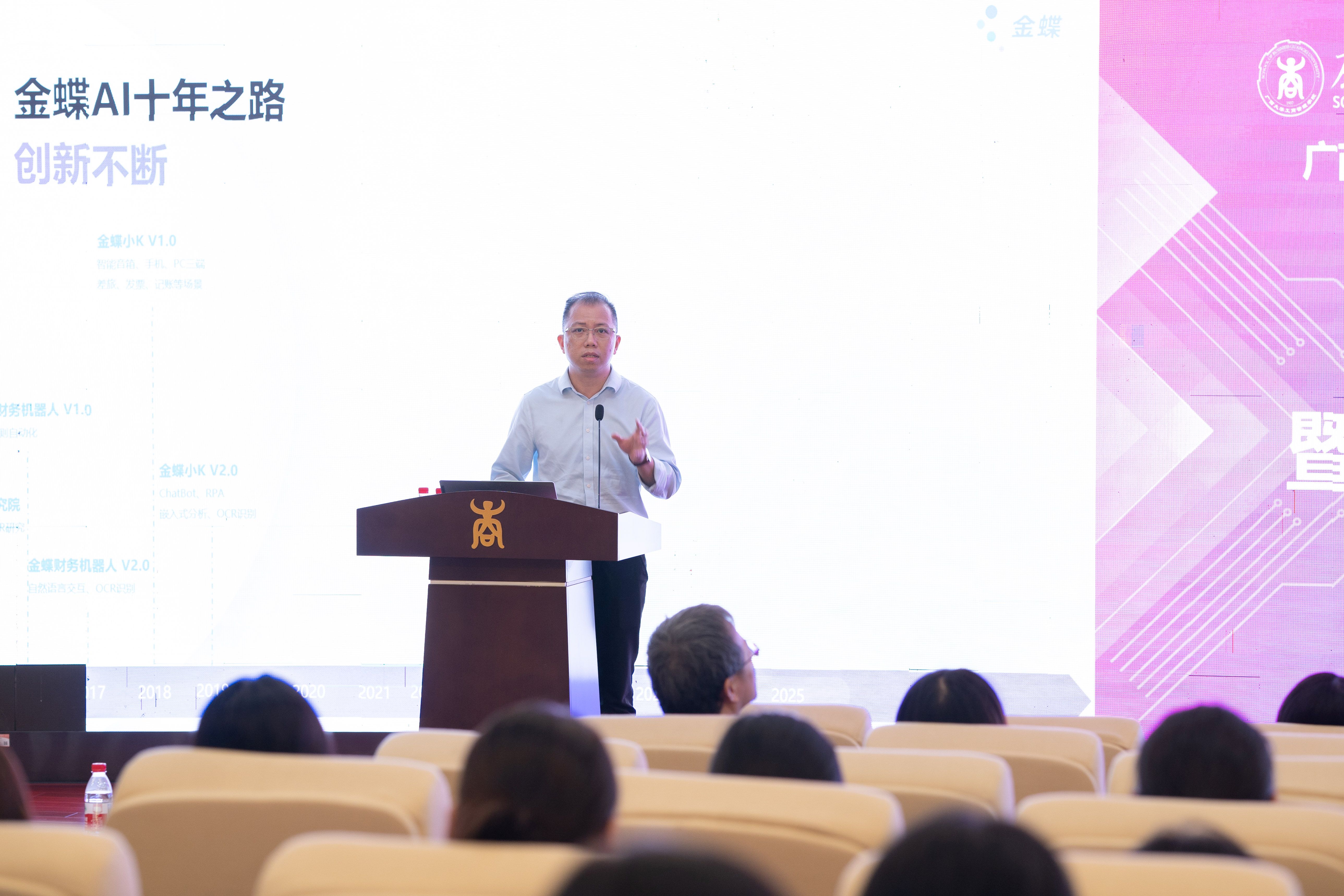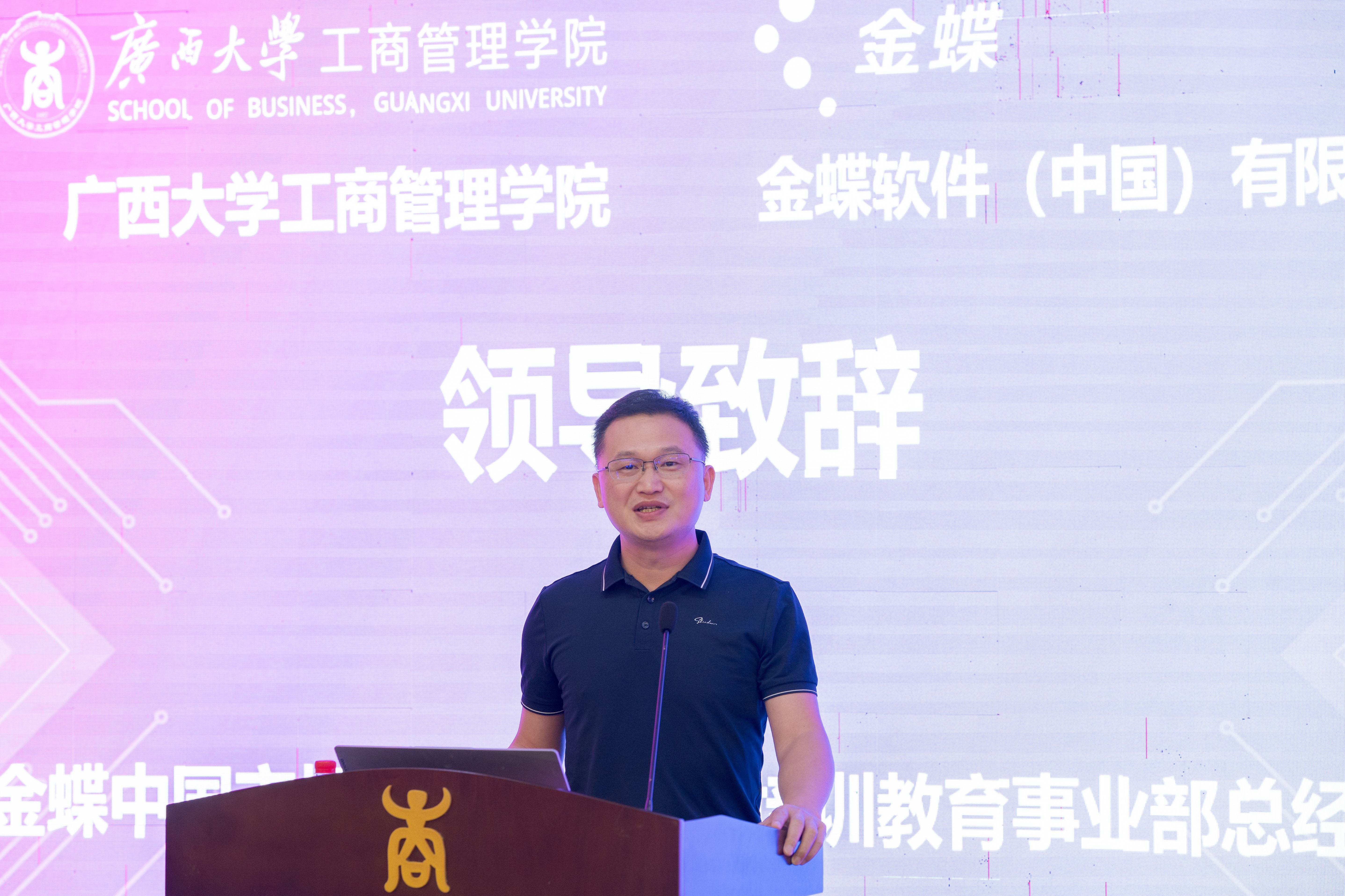 黄晋在致辞中指出,人工智能是引领新一轮科技革命与产业变革的核心驱动力,工商管理学科必须积极回应数智化趋势。公司将通过“人工智能+”人才培养模式,推动会计、市场营销、人力资源管理、旅游管理、供应链管理等多个专业与数字技术深度融合,着力培育具备数字素养和跨界整合能力的高素质管理人才。他强调,与金蝶共建人才培养基地,是公司推进学科数智化升级、深化产教融合的重要举措,期待双方在产教融合新范式、人才培养新体系和科研合作新路径等方面取得实效。