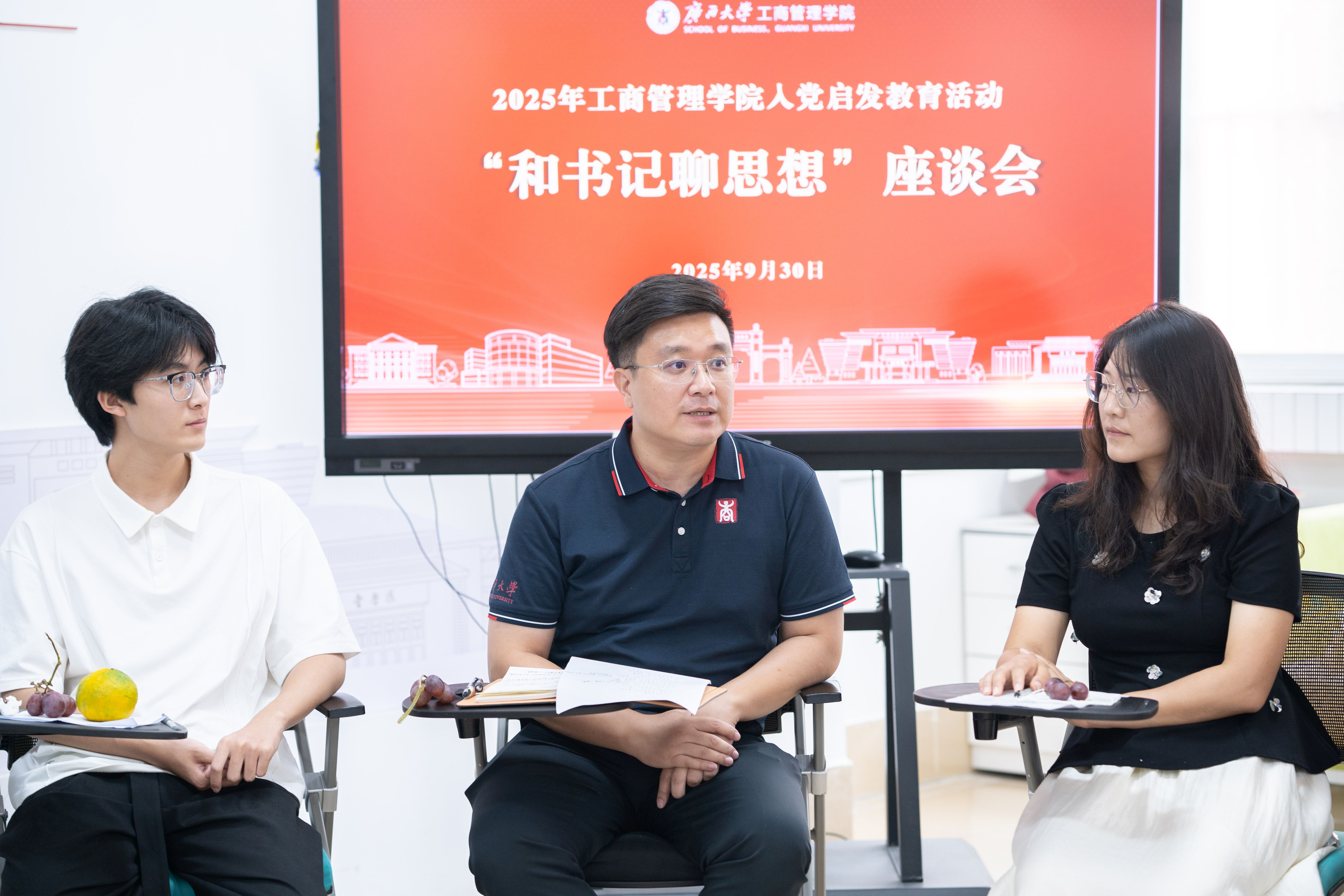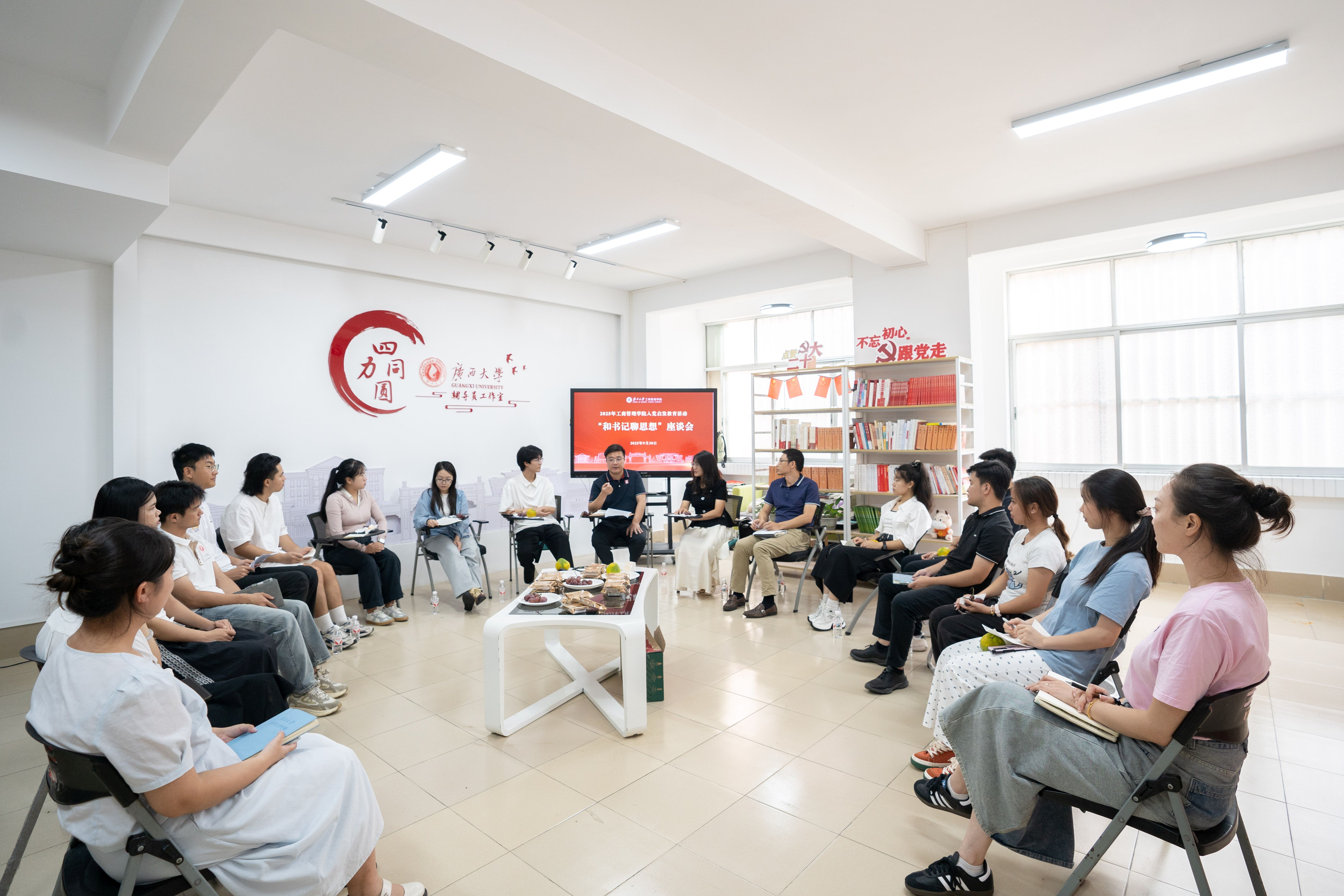 座谈会现场气氛轻松热烈,同学们围绕专业学习、科研方向、校园生活等话题积极发言,坦诚分享初入大学时的困惑与对未来的美好期待。2025级博士生吕婷婷分享了自己过往科研探索中的深刻感悟和考博经历,表示将秉持严谨治学的态度,全力以赴投入科研,期望能在关键领域取得突破性成果。来自广东的龙其烁别出心裁地分享了家乡中秋节的独特习俗,他感慨道,虽然此次不能在家乡与家人共度中秋,但公司这个大家庭给予的温暖让他倍感亲切。他期待能与同学们一起度过一个意义非凡的节日,同时也表达了深耕专业领域,争取在权威期刊上发表高质量论文、提升科研实践能力的决心。工商管理252班刘思思则希望在本科阶段能充分利用公司丰富的社团资源和活动平台,全方位锻炼自己的组织协调、沟通表达等综合能力,以更加自信和全面的姿态迎接未来的挑战……其他新生也纷纷敞开心扉,与书记深入交流思想,分享个人成长规划,共绘青春奋斗蓝图。