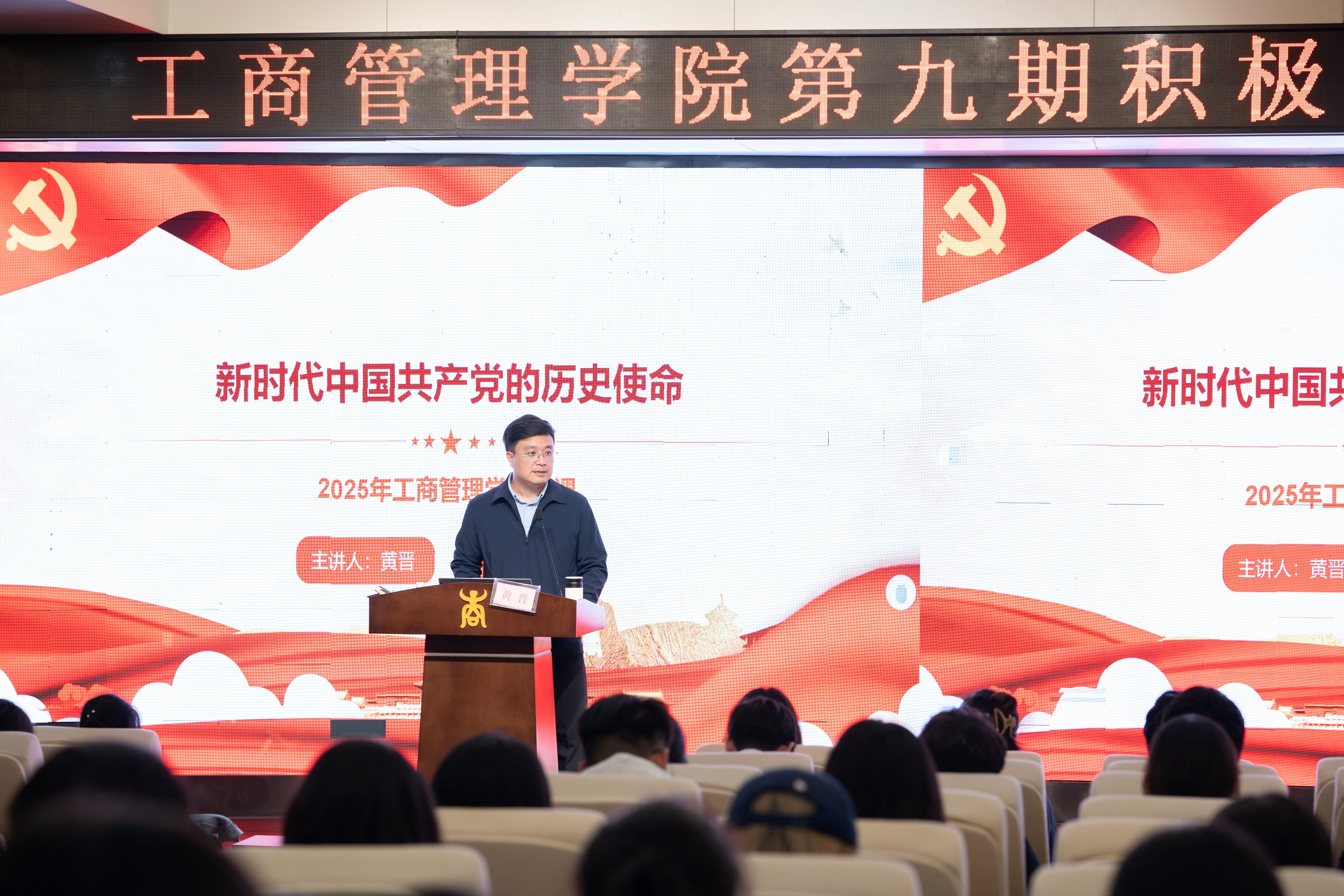 开班仪式后,黄晋以“新时代中国共产党的历史使命”为主题讲授专题党课。他结合党的百年奋斗历史脉络与新时代鲜活实践案例,深入浅出地阐述了新时代中国共产党历史使命的丰富内涵和重大意义。他指出,作为新时代青年学子,既是民族复兴伟业的见证者,更是肩负重任的参与者、建设者,希望同学们在加强理论学习、锤炼过硬本领中积蓄成长力量,将个人的成长成才与国家的发展、民族的复兴紧密结合起来,书写无愧于时代、无愧于人民的青春华章。