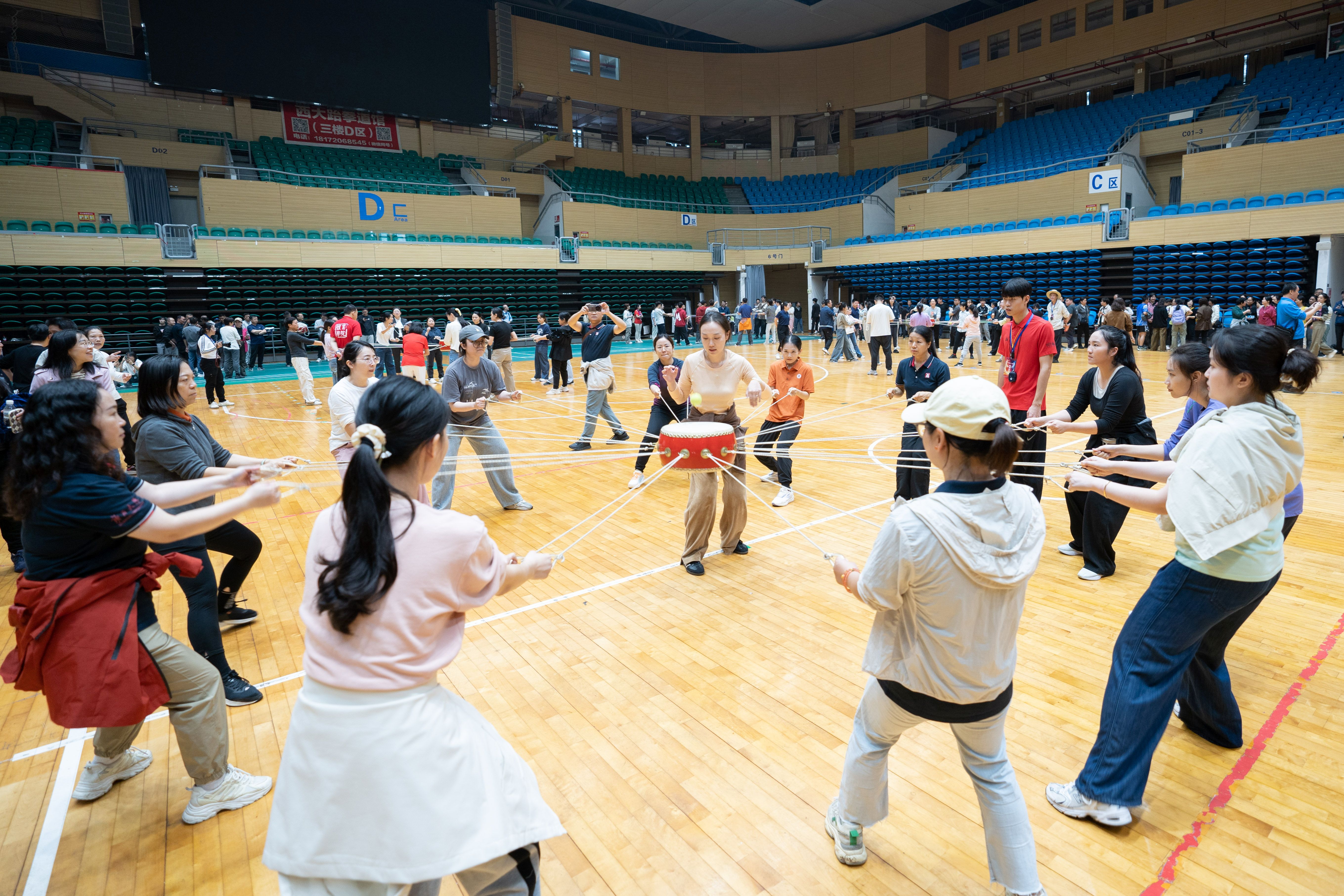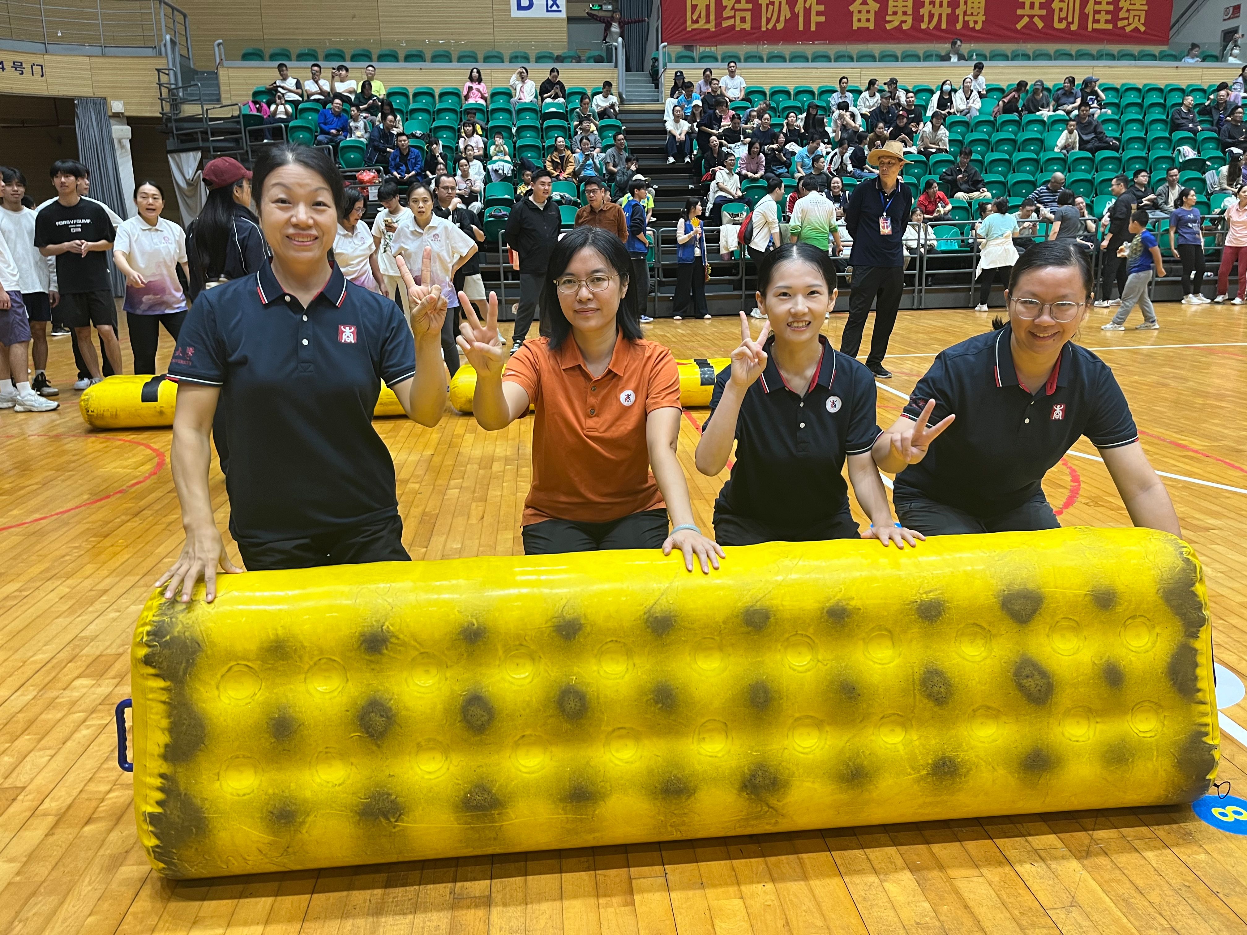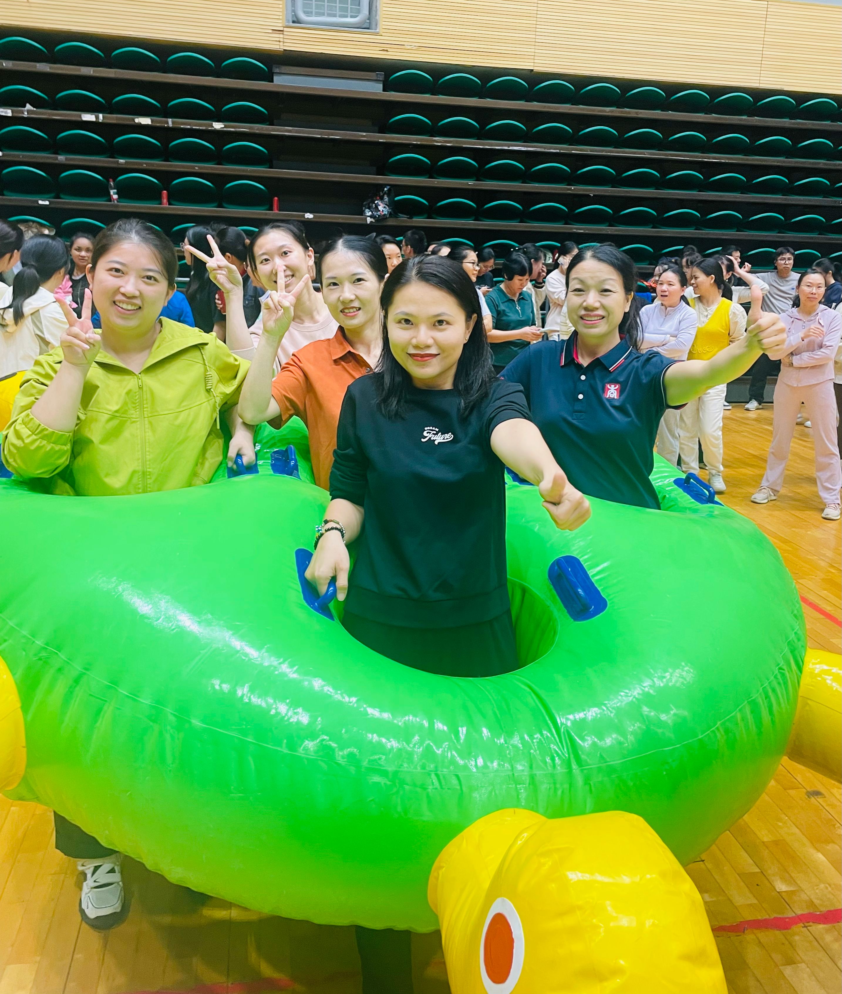 公司代表队在女子击鼓颠球比赛中