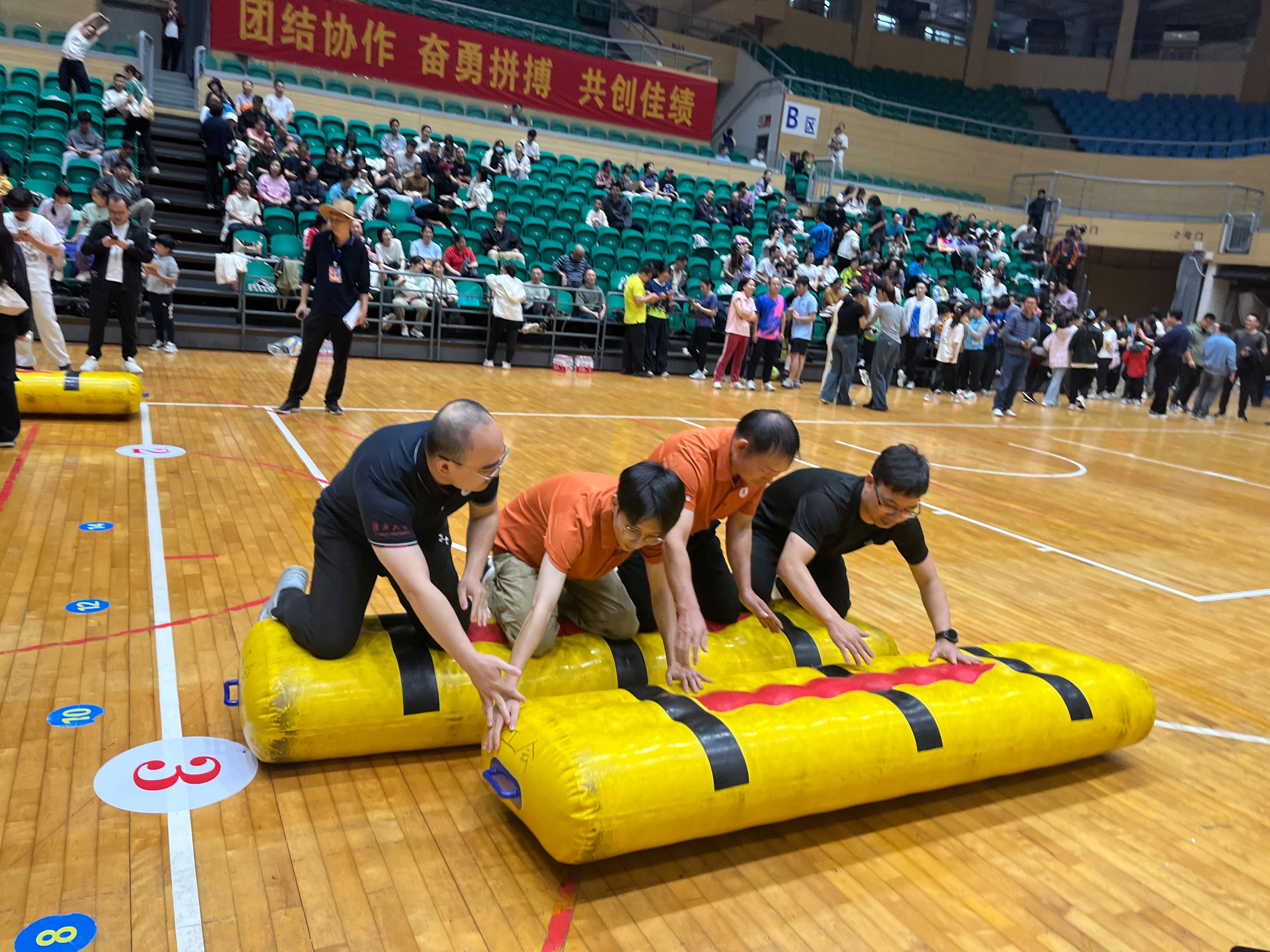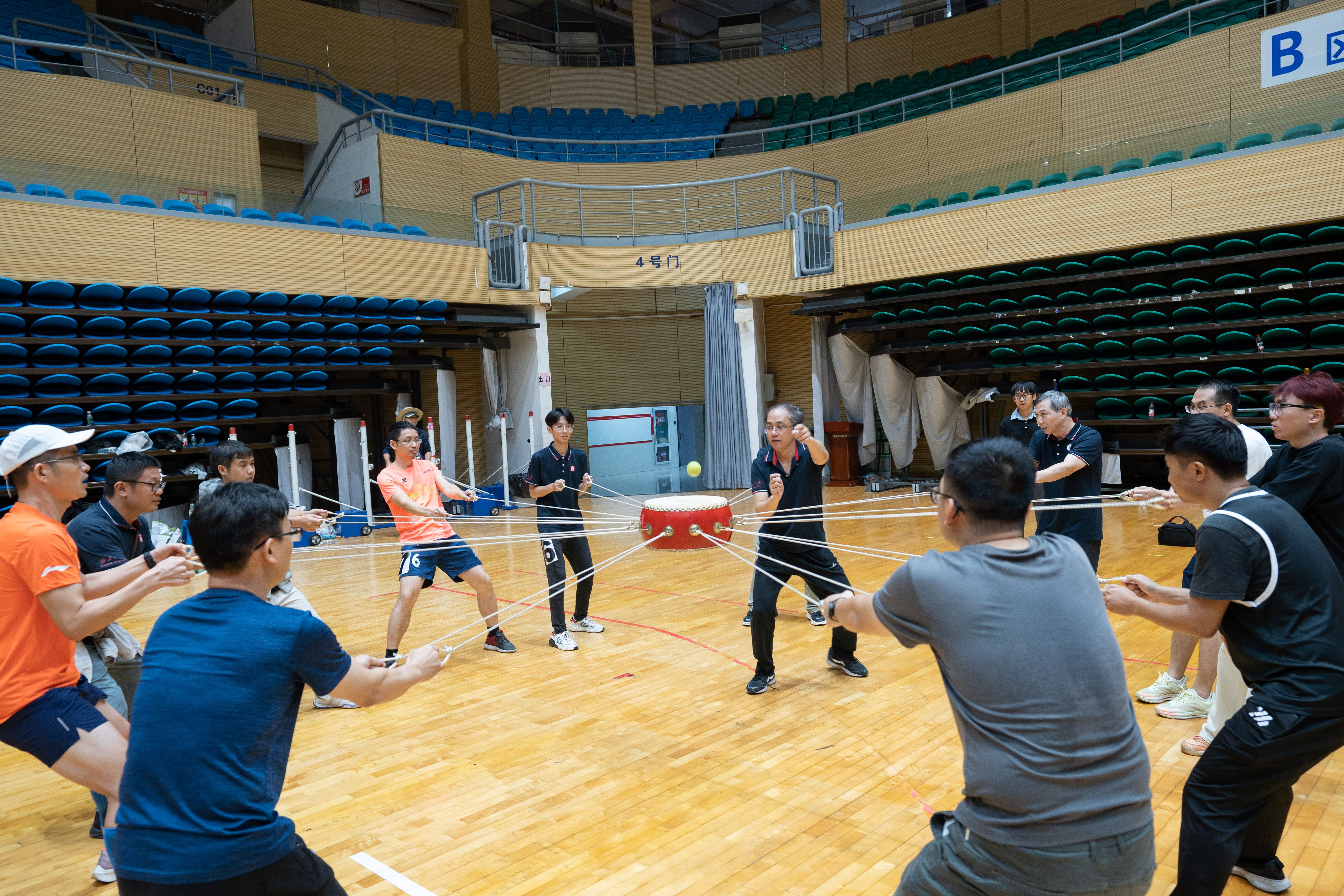 公司代表队在男子击鼓颠球比赛中