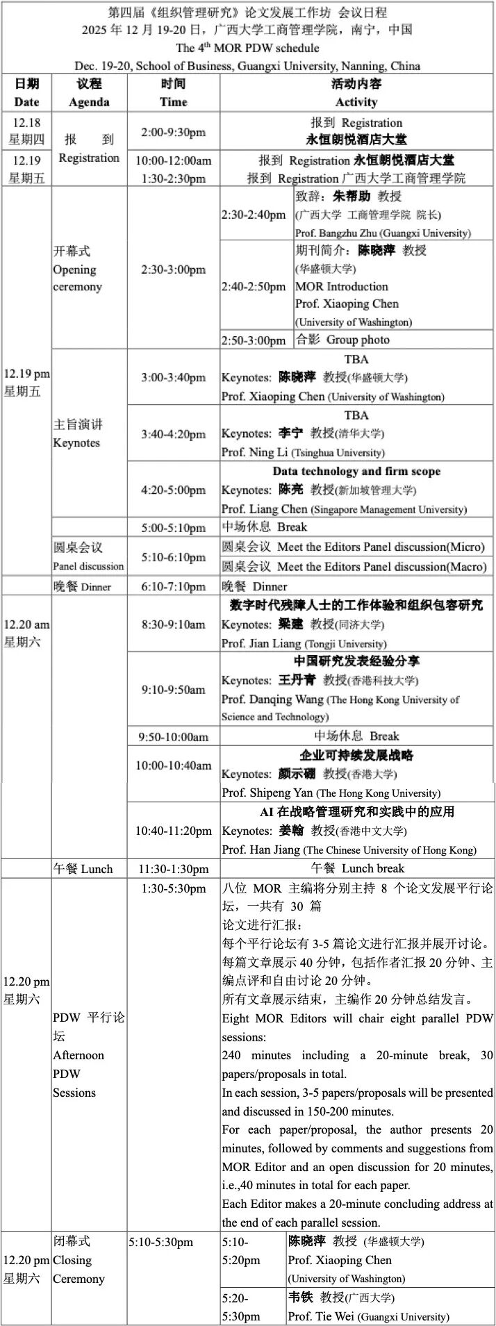 我们诚挚地邀请您参加第四届《组织管理研究》(MOR)论文发展工作坊。本阶段会议主要包括特邀嘉宾主题学术报告和论文发展工作坊平行论坛两个部分。8场论文发展工作坊平行论坛由MOR主编陈晓萍教授及7位副主编和资深编辑主持。论文发展工作坊平行论坛将对经过评审后接受的论文全文和详细版研究计划书进行深入讨论,这些接受的投稿将获得MOR编辑团队的详细指导反馈。