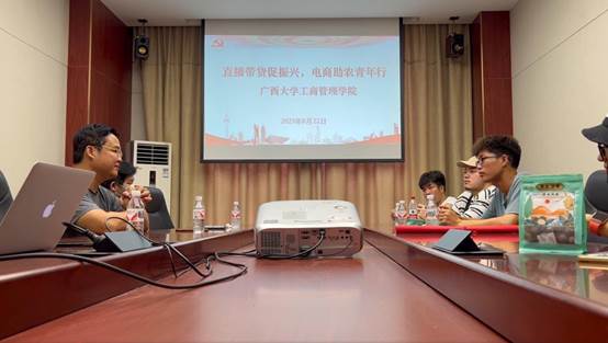 首先,实践团来到龙州县电子商务服务中心。联谊会黄会长给同学们详细介绍了龙州的特产,包括银耳露、坚果和甘蔗等一系列产品。随后参观直播场地,并与相关工作人员开展座谈。在座谈会上,同学们了解到直播行业对当地经济所起的促进作用以及遇到的困难,如产量大销量小、直播流量少、知名度不高等,虽然有着丰富的资源和潜力,但目前缺乏专业人才的支持。因此,黄会长表示希望更多有知识、有技能的年轻人回乡发展,推动乡村振兴战略的实施。
