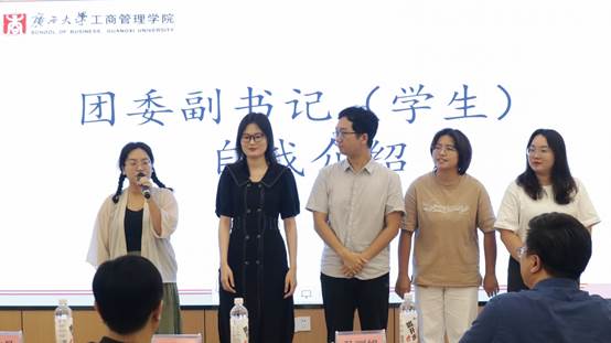 2023年9月26日晚19时,公司第二届研究生团学组织第一次全体委员会在122教室召开,2023级新生成员集体亮相。公司党委副书记黄晋、院团委书记马丽娟、院团委副书记岑汉成、学工组辅导员张艳红、王乐、郁文丹出席本次会议。