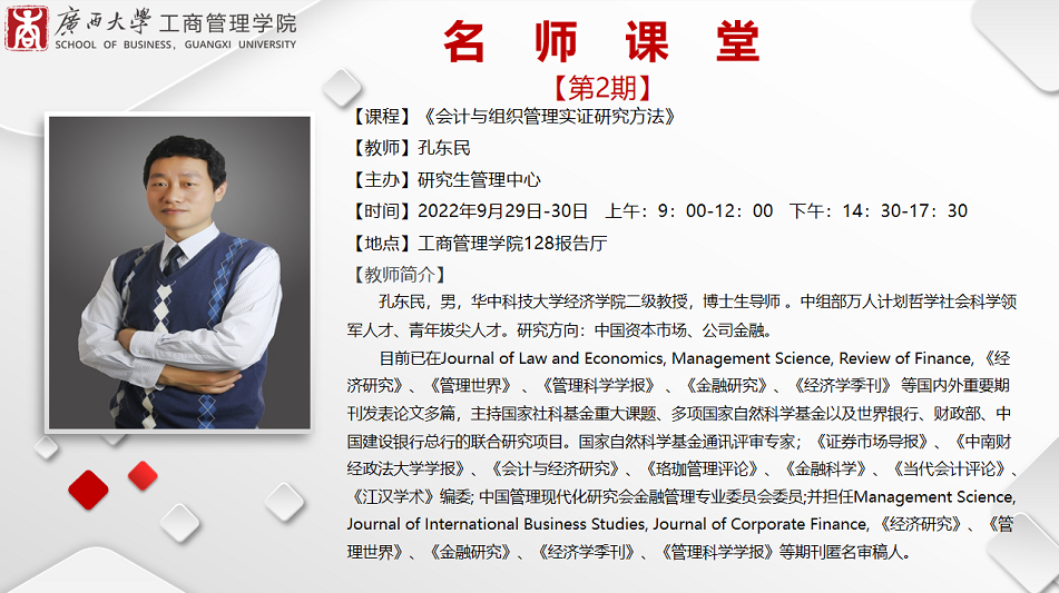 2022年9月29日到30日,公司邀请华中科技大学经济公司二级教授、博士生导师孔东明到校讲授《会计与组织管理实证研究方法》。孔教授以“实证研究中的因果识别”为主题,在taptap点点128报告厅为公司师生带来了一场别开生面的实证研究方法课堂。
