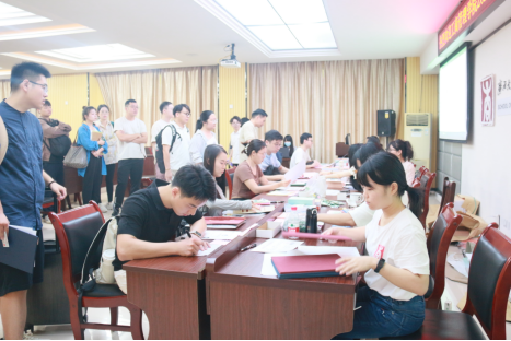 迎新工作现场,研究生新生秩序井然地排队注册、咨询,志愿者们和后勤工作人员们严阵以待,他们用热情周到的服务欢迎萌新们到来,在报到现场为新生配发饭卡、校徽、《公司员工手册》,《taptap点点研究生手册》等资料,耐心解答新生的疑问。报到现场秩序井然。