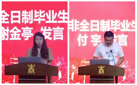 2023届MBA毕业生代表谢金亭、付宇向母校的辛勤培育表达了诚挚的感谢,他们表示,经过两年的学习,大家共同进步,收获满满。毕业并不意味着结束,而是一个新的开始。在未来的工作中他们将继续努力,真正成为奋进新时代的复兴栋梁。