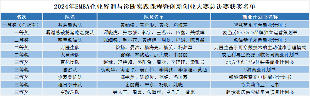 11月21日晚,经过近4个小时激烈而精彩的角逐,2024年EMBA企业咨询与诊断实践课程暨创新创业大赛总决赛圆满落幕。2024级EMBA员工组成的32个小组,经过选拔赛的比拼,共有10支队伍脱颖而出,凭借总决赛的精彩表现,最终产生一等奖2名、二等奖3名、三等奖5名。