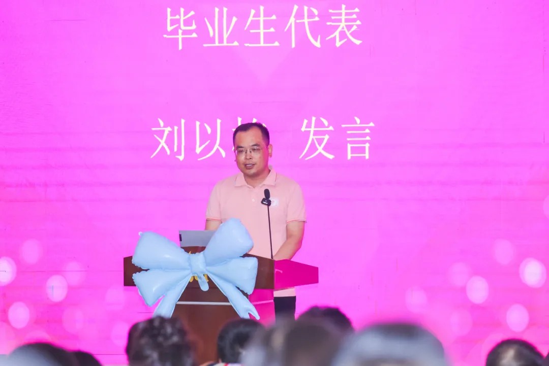 毕业生代表EMBA24班刘以栋在发言中以三个关键词,分享两年的难忘时光。一是感恩,感谢公司与老师;二是担当,要以扎实学识和过硬本领,为中华民族伟大复兴贡献自己的一份力量;三是祝福,祝愿母校再谱华章,祝愿老师桃李满天下,祝愿同学们鲲鹏展翅,前程似锦。