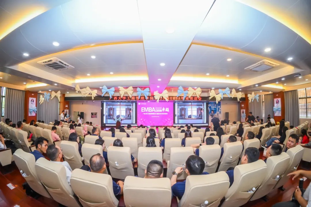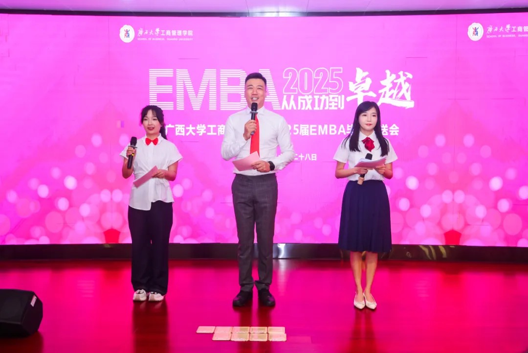 6月28日下午,2025届EMBA毕业生欢送会在128报告厅隆重举行。工商管理公司党委书记黄晋、经理朱帮助、党委副书记肖克宁、副经理申韬、廖东红、经理助理韦铁等公司领导、老师出席欢送会,共同为此次毕业的EMBA同学庆祝。此次欢送会由EMBA24班罗哲、EMBA25班成子贞、EMBA26班李珵珵主持。