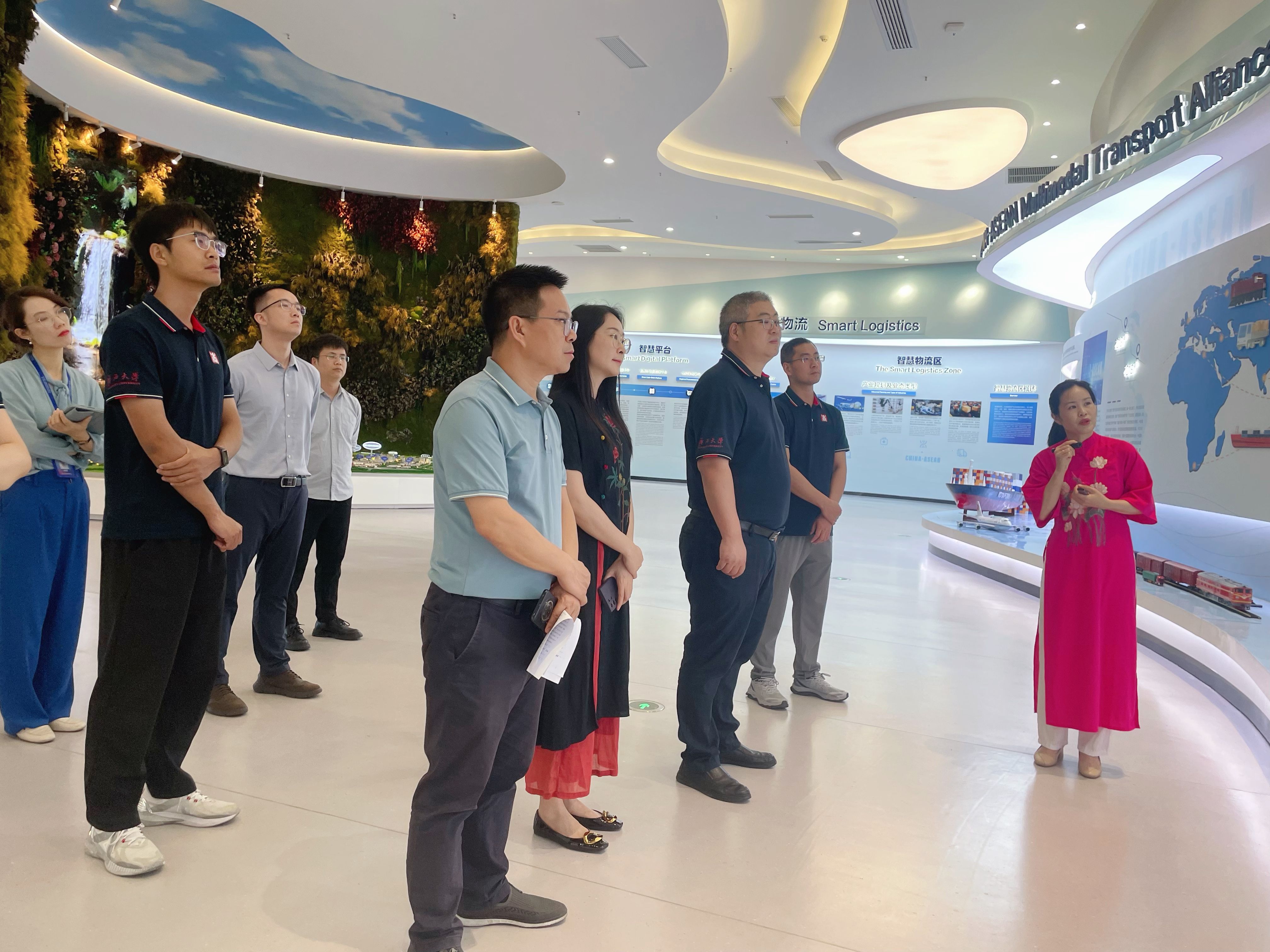 在中国—东盟特色商品汇聚中心副总经理李丹、活动策划部总经理刘金生等陪同下,调研组先后参观了中新南宁国际物流园展厅、汇聚中心新加坡馆、马来西亚、越南、印尼、泰国、缅甸等国家特色展馆及中国—东盟水果交易中心展厅,了解其在促进中国-东盟商贸互通中的枢纽作用。座谈会上,广西新中产业投资有限公司、中国—东盟特色商品汇聚中心董事长赵海燕提出企业人才需求及东盟商贸培训合作意向,双方就共建创新创业基地达成共识。朱帮助表示,公司将结合东盟区域经济特色,联合企业开发定制化课程,为跨境物流与商贸领域培养高素质复合型人才。