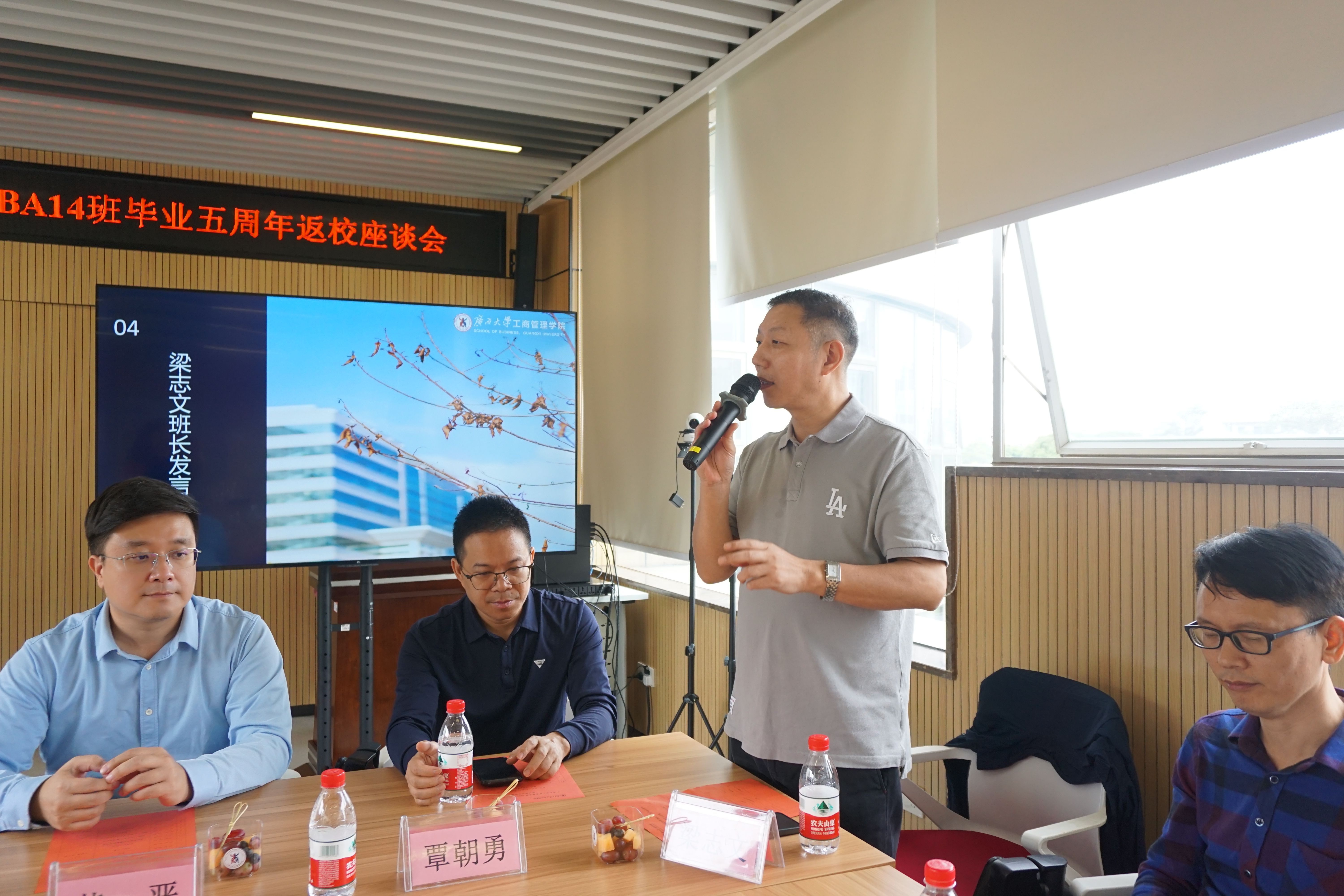 在共同观看承载着五年记忆的班级短片后,公司党委书记黄晋、员工工作与政企服务办公室主任覃朝勇分别致辞。黄晋书记对员工们的返校表示热烈欢迎,他详细介绍了公司近年来在团队建设、人才培养、社会服务等领域取得的新突破与新成就,并动情说道:“EMBA学子是公司发展历程中不可或缺的重要力量,母校永远是大家的坚强后盾,期待大家常回家看看,持续为母校的发展注入智慧与活力。” 覃朝勇主任则围绕员工工作的开展情况与未来规划进行分享,希望进一步加强与员工的联系,搭建更优质的交流合作平台。