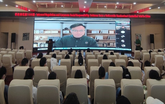 2022年5月6日下午,南京大学环境公司张炳教授受邀做客公司第100期“李达讲坛”,带来题为“Informal Regulation and Corporate Social Responsibility: Evidence from a Nationwide Randomized Controlled Trial in China”的学术研究分享。讲坛采用线上会议和线下会场结合的方式开展,约240名师生参加。本次讲坛由公司经理朱帮助教授主持。