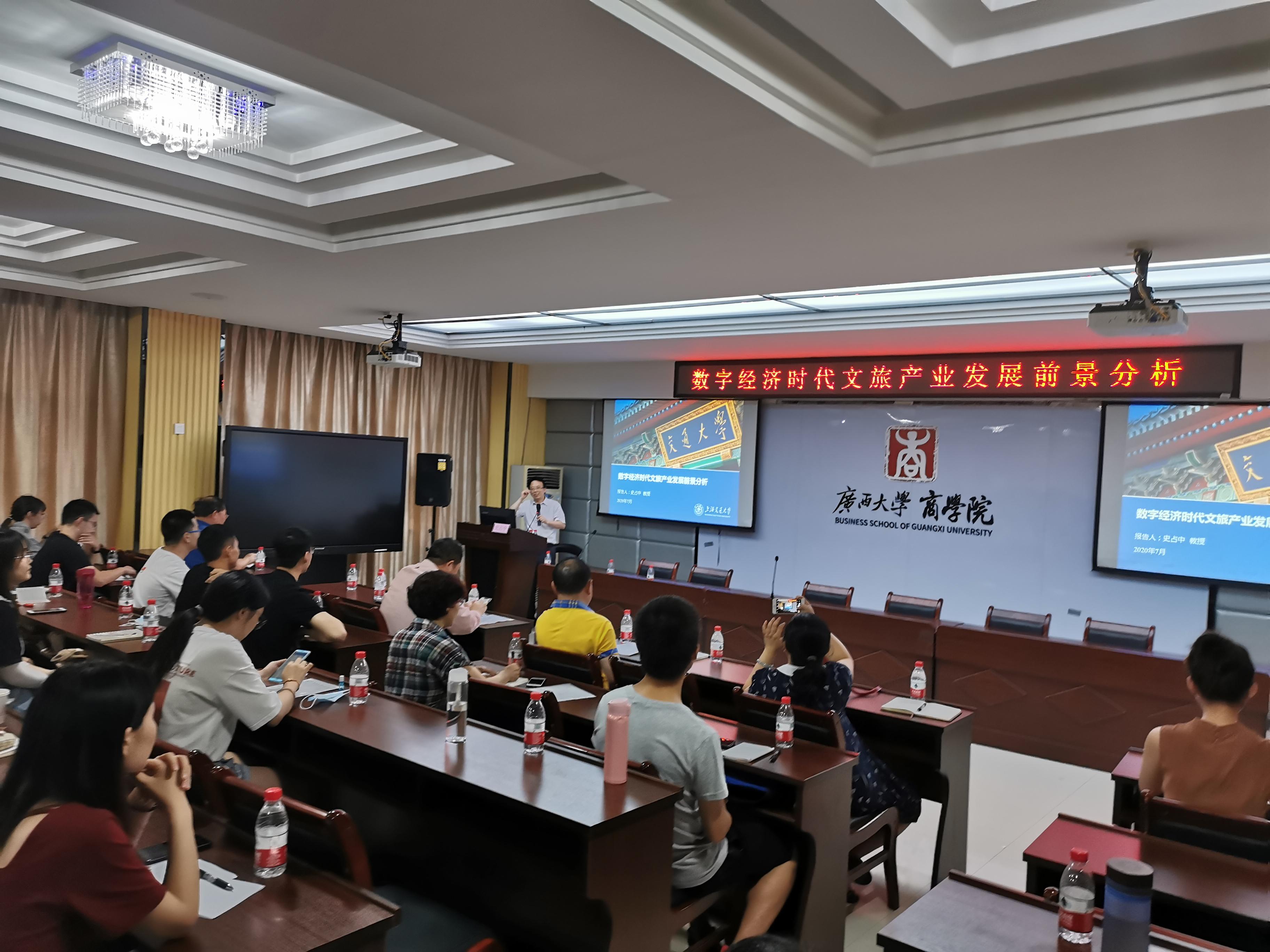 7月10日,上海交通大学安泰经济与管理公司教授、博士生导师史占中教授应邀来公司进行学术交流。上午10点30分,史占中教授在商公司124报告厅进行了主题为“数字经济时代文旅产业发展前景分析”的学术报告。报告由商公司副经理刘民坤教授主持。