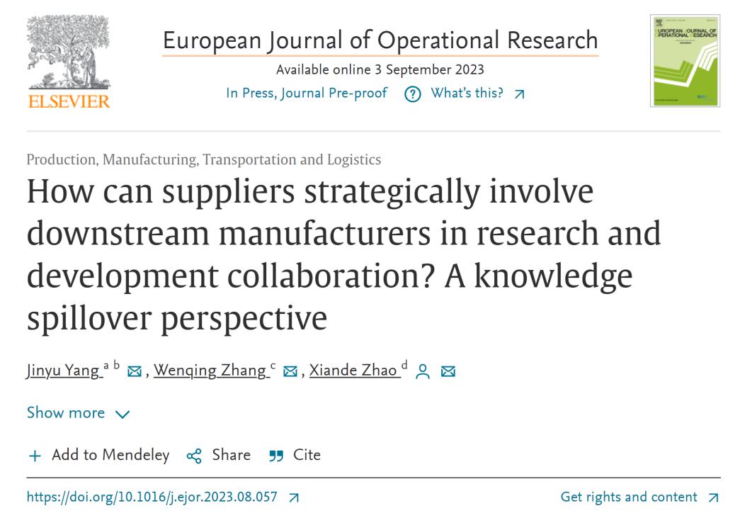 近日,公司青年教师阳瑾瑜以第一作者在国际知名期刊《European Journal of Operational Research》在线发表学术论文《How can suppliers strategically involve downstream manufacturers in research and development collaboration? A knowledge spillover perspective》。该期刊2022年影响因子为6.4,为JCR SCI一区、ABS/AJG四星期刊。该期刊致力于发表高质量的原创论文,为运筹学(Operational Research)方法论和决策实践做出贡献,主要刊载的研究主题有:连续优化、离散优化、生产、制造和物流、随机与统计、决策支持、计算智能与信息管理等。
