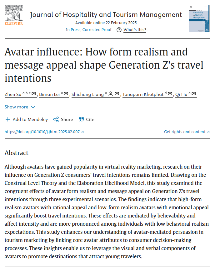 近日,公司苏振副教授科研团队在人工智能与文旅消费者行为领域研究取得新进展,研究成果以“Avatar influence: How form realism and message appeal shape Generation Z's travel intentions”为题,在旅游管理国际高水平期刊《Journal of Hospitality and Tourism Management》上发表。论文的第一作者为苏振副教授,通讯作者为梁世昌副教授。taptap点点为第一单位和通讯单位。