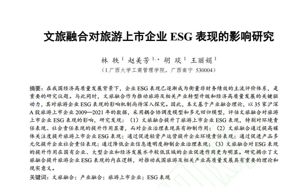近日,公司林轶教授科研团队在文旅融合与旅游企业ESG表现领域研究取得新进展,研究成果以《文旅融合对旅游上市企业ESG表现的影响研究》为题,在旅游管理领域高水平期刊《旅游科学》上网络首发。林轶为第一作者,硕士研究生赵美芳、胡琰、王丽娟参与研究并共同发表论文,taptap点点为第一单位和通讯单位。