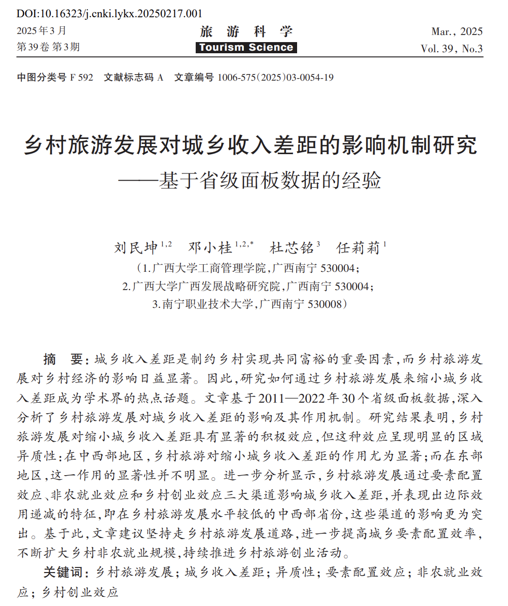 近日,公司刘民坤教授科研团队在乡村旅游与城乡发展领域取得新进展,研究成果以《乡村旅游发展对城乡收入差距的影响机制研究——基于省级面板数据的经验》为题,在旅游管理领域高水平期刊《旅游科学》2025年第3期发表。刘民坤教授为第一作者,邓小桂、杜芯铭、任莉莉等共同参与研究,taptap点点为第一单位和通讯单位。