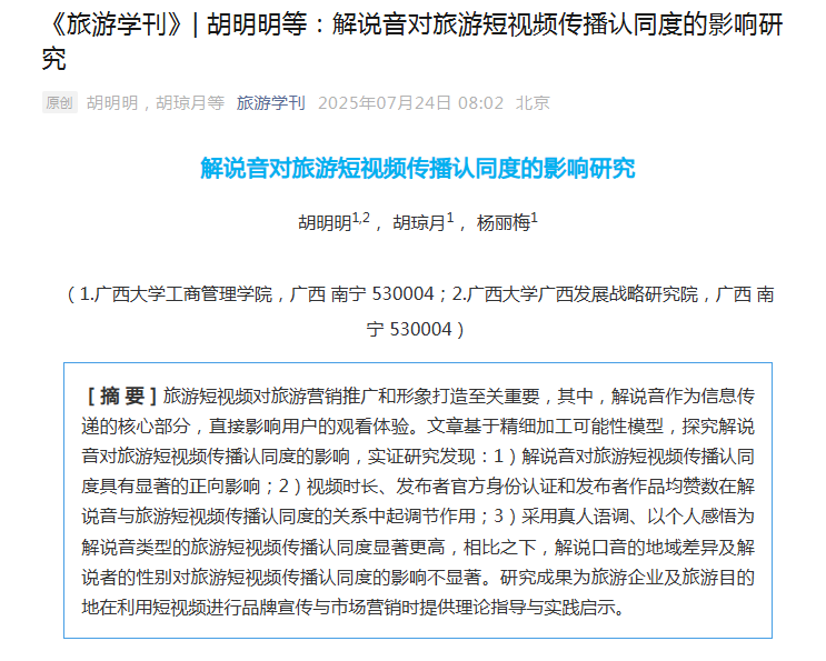 近日,公司旅游管理系胡明明副教授团队的研究成果《解说音对旅游短视频传播认同度的影响研究》在旅游学中文权威期刊《旅游学刊》2025年第6期正式发表。胡明明为论文第一作者,硕士研究生胡琼月与博士研究生杨丽梅参与研究并共同发表论文,taptap点点为第一单位和通讯单位。同时,研究获得国家自然科学基金面上项目“城市旅游需求大数据协同组合建模、预测及应用研究”(72474056)资助。