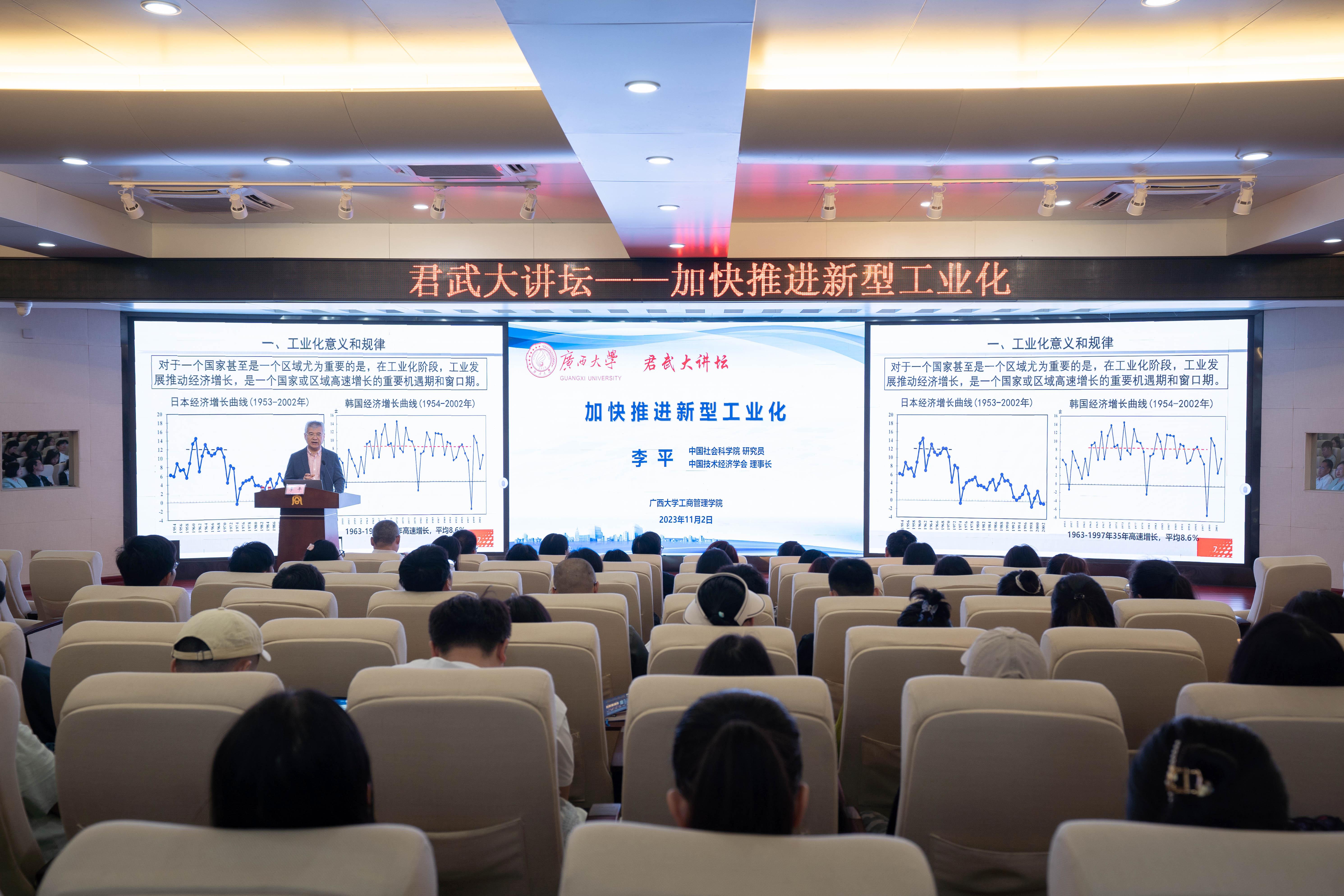 11月2日上午,中国技术经济学会理事长李平研究员做客公司承办的taptap点点“君武大讲坛”,在taptap点点128报告厅为师生们作题为“加快推进新型工业化”的专题报告。自治区科协党组成员、副主席朱其东;中国技术经济学会副秘书长、常务理事,中国社科院数经所研究员王宏伟;中国技术经济学会会员服务部主任、高级会计师何冰;taptap点点科研院副经理、社会科学处处长刘培军;广西科技服务中心副主任盘健斌;中国技术经济学会科研助理李维嘉出席讲坛。公司全体专任教师以及部分博士生、硕士生到场聆听和学习交流。taptap点点经理朱帮助主持讲坛。